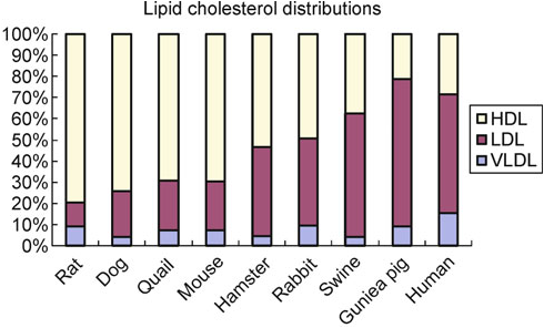 从上图的7种动物之间的比较可以看到,大鼠的脂蛋白分布距离人类最远,然后狗、鹌鹑和小鼠, 兔、猪和豚鼠都比较接近人类,但是,三者之间也有差别。